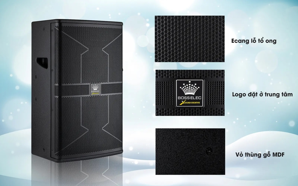 Lấy cảm hứng từ các phòng thu chuyên nghiệp, loa karaoke BossElec M-12 sở hữu thiết kế chữ nhật đứng tinh tế, nổi bật trong mọi không gian. Logo được đặt trang trọng ở trung tâm màng loa, lớp lưới bảo vệ bằng thép phủ sơn nano chống rỉ, tạo độ bóng và dễ dàng vệ sinh. Các đường vân tinh xảo trên mặt trước càng tô điểm thêm vẻ sang trọng cho sản phẩm.