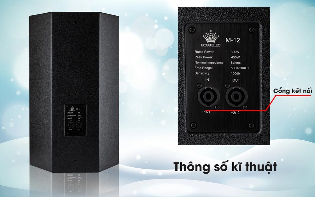Với công suất 450W, BossElec M-12 là lựa chọn lý tưởng cho phòng hát gia đình và kinh doanh quy mô trung bình. Trở kháng 8 Ohm, độ nhạy 100dB và dải tần 50Hz – 20KHz đảm bảo âm thanh chất lượng cao. Hai cổng kết nối đơn giản giúp bạn dễ dàng kết nối với các thiết bị âm thanh khác.