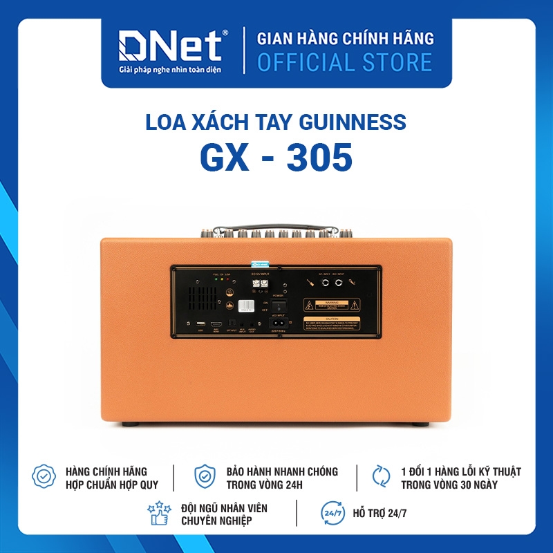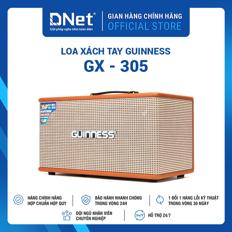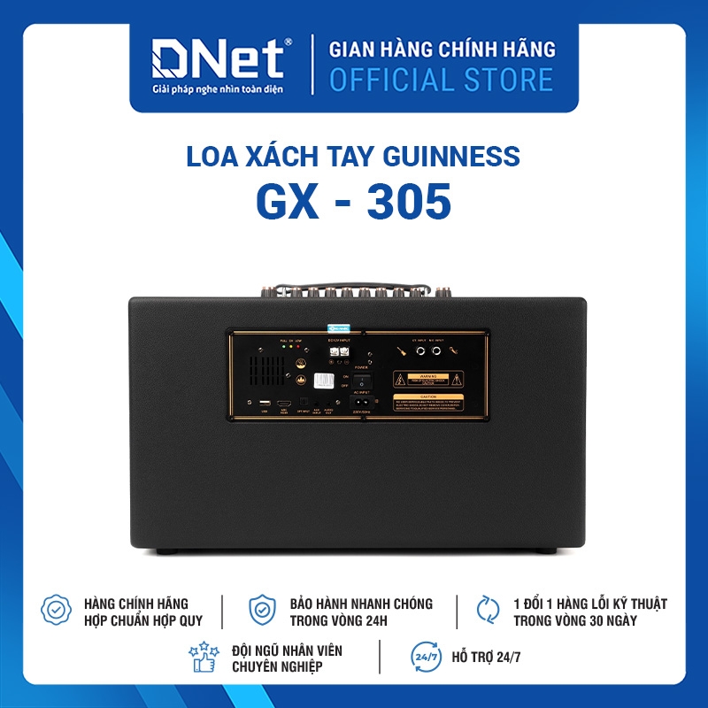 Loa GUINNESS GX-305 hoạt động với công suất thực 100W, âm thanh toàn dải nhờ cấu trúc 2 củ bass và 2 củ loa treble, mang lại chất lượng âm thanh chuyên nghiệp. Sử dụng pin sạc tiện lợi và kết nối Bluetooth 5.2.