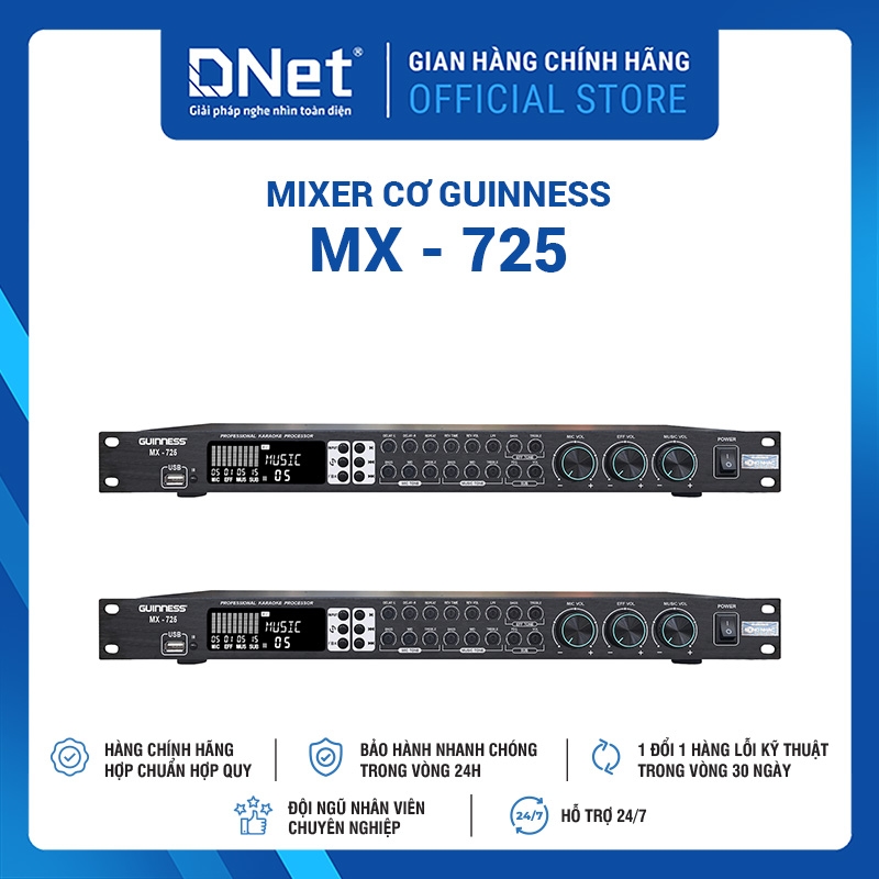Mixer cơ GUINNESS MX-725 là thiết bị xử lý âm thanh thế hệ mới, được sản xuất dựa trên công nghệ hiện đại của Hàn Quốc. Được trang bị nhiều tính năng vượt trội, thiết bị này mang đến trải nghiệm giải trí karaoke hoàn hảo cho người dùng.