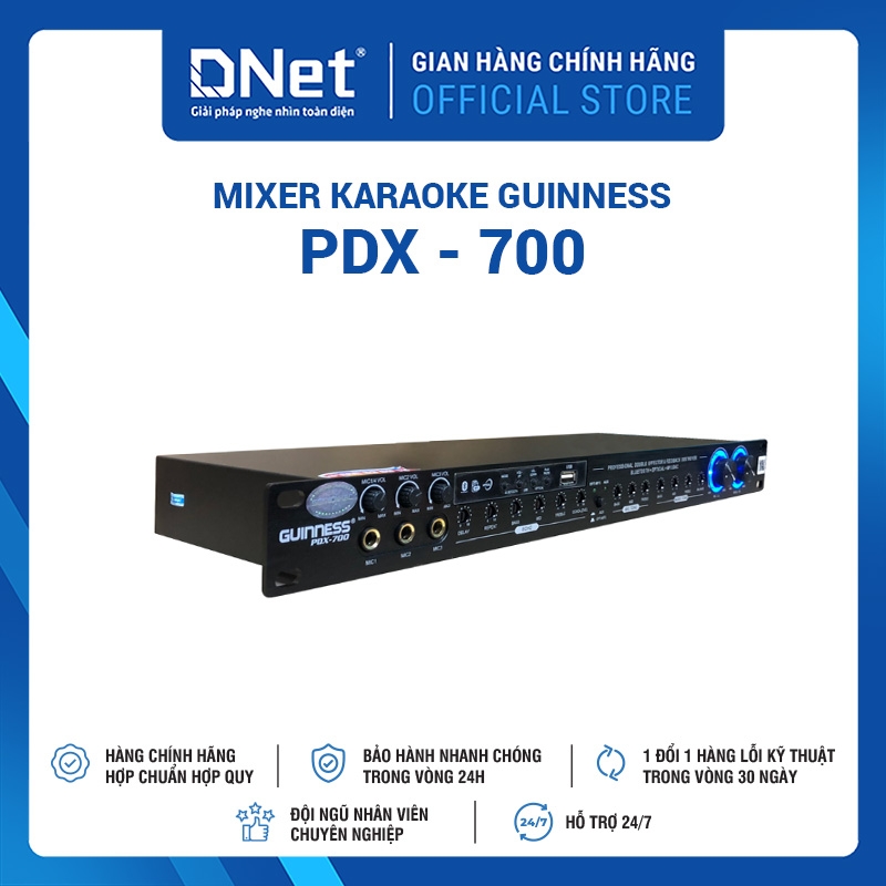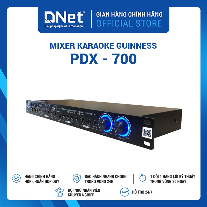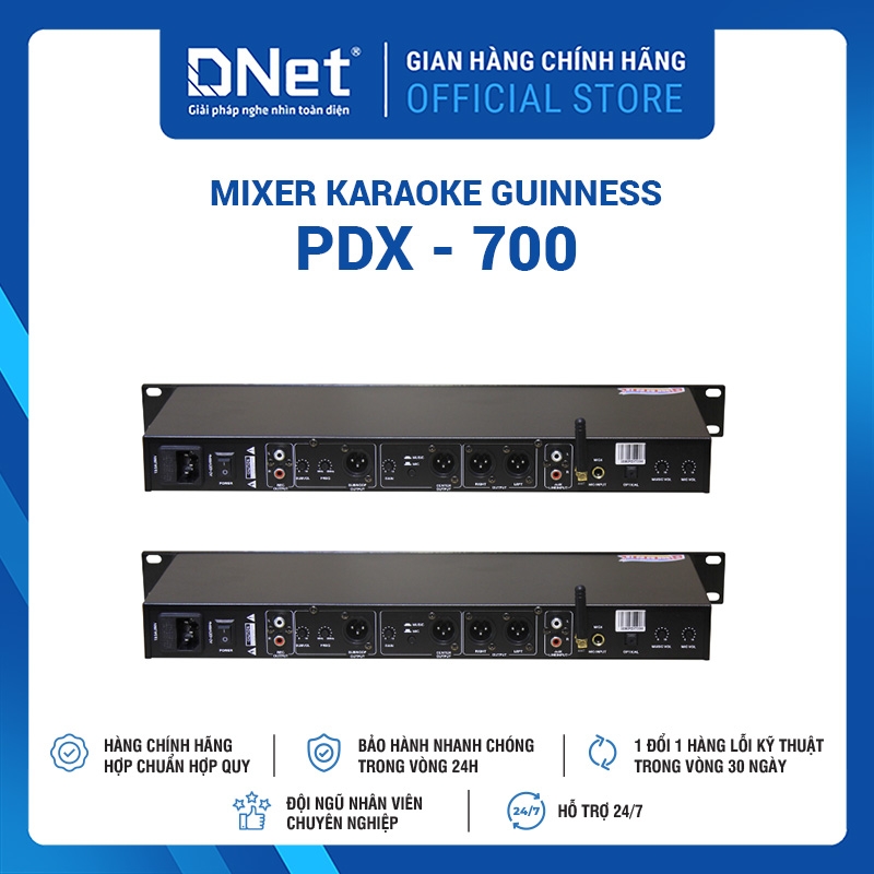Bên trong sản phẩm sử dụng linh kiện dán (SMD) và kỹ thuật tiên tiến, nhằm tăng hiệu quả âm thanh khi hát karaoke. Vang cơ sử dụng 2 bộ xử lý tạo hiệu ứng vang cho Micro mượt mà hơn hẳn. Sản phẩm tích hợp mạch chống hú (feedback) kỹ thuật số chuyên nghiệp bên trong giúp chống tình trạng hú rít cho Micro. Mixer GUINNESS PDX - 700 sử dụng linh kiện chính hãng giúp sản phẩm đáp ứng tần số cao, giảm tỷ số tín hiệu nhiễu và hệ số biến dạng. Đáp tuyến tần số rộng (20Hz - 20kHz), giảm tỷ số tín hiệu nhiễu và hệ số biến dạng.